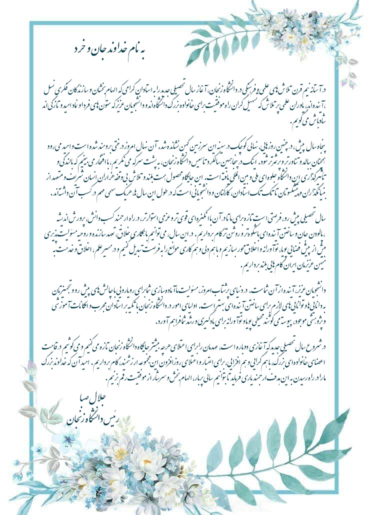 آغاز سال تحصیلی جدید را به همه دانشگاهیان ارجمند به ویژه دانشجویان ورودی جدید صمیمانه تبریک عرض مینمایم.