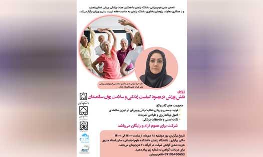 انجمن علمی علوم ورزشی دانشگاه زنجان با همکاری هیات پزشکی ورزشی استان زنجان و با همکاری معاونت پژوهشی دانشگاه زنجان، به مناسبت هفته تربیت بدنی و ورزش برگزار میکند: