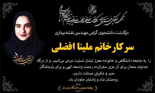 با نهایت تأثر و اندوه، رحلت دانشجوی گرامی دانشگاه زنجان ، “سرکارخانم ملینا افضلی” دانشجوی مهندسی نقشه برداری، را به جامعه دانشگاهی و خانواده معزز ایشان تسلیت عرض میکنیم. و از درگاه خداوند متعال برای آن عزیز سفرکرده رحمت واسعه الهی و برای بازماندگان صبر و شکیبایی مسئلت داریم.