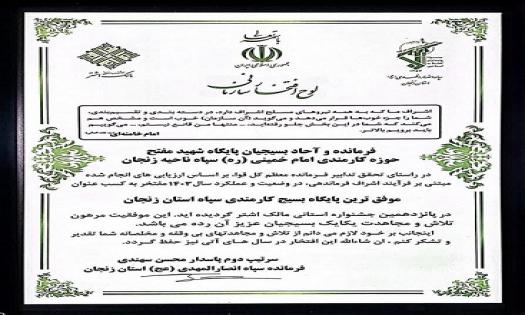 در راستای تحقق تدابیر فرمانده کل قوا ،بر اساس ارزیابی های انجام شده مبتنی بر فرآینداشراف فرماندهی ،دروضعیت و عملکرد سال 1403مفتخر به کسب عنوان موفق ترین پایگاه بسیج کارمندی استان زنجان در پانزدهمین جشنواره مالک اشتر گردید.
